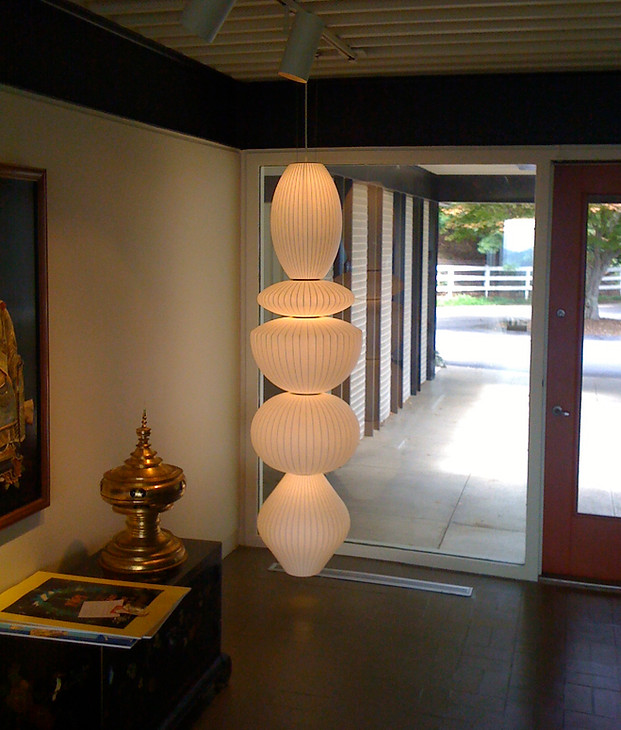 The home originally had a similar hanging lamp in the foyer, now long gone, but we created one that pays homage to its predecessor using George Nelson lamps and thin cables.
